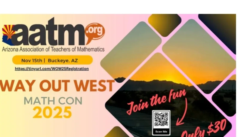 Thank you for your interest in attending the Arizona Association of Teachers of Mathematics (AATM) Way Out West Math Con '25! The conference will be held on Saturday, November, 15, 2025 at John S. McCain III Elementary School, located at 3170 247th Avenue in Buckeye, AZ 85326. The conference starts at 9:00 AM and ends